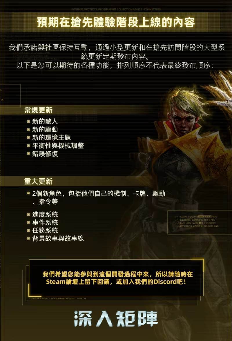 「在搶先體驗期間,我們計劃將會先後發佈總共四名角色;每一名角色都會帶來新玩法、卡牌、敵人、劇情。