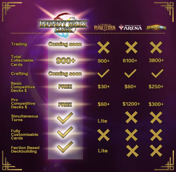 • Death to Pay to Win - Never have to pay or grind for a card, ever again! Every player has free access to every card we've ever made and will ever make. Any player already heavily financially invested in another card game, can jump into Infinity Wars Classic (IWC) right now, and not be destroyed by veteran players, just because they haven’t collected enough cards to be competitive.
