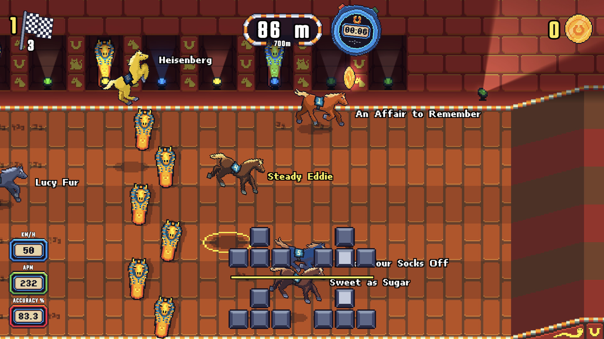 Wild Horse Racing is a fast-paced arcade horse racing game where timing is everything! Master control patterns from easy to godlike difficulty, leap over big jumps, and race through vibrant tracks around the world. Climb the leagues, manage your horse, and gallop from bronze to gold!