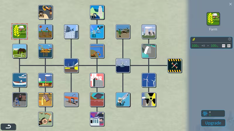 As the game progresses, players can upgrade buildings by accumulating scientific research points, which in turn increases the revenue generated by the buildings, accumulating more wealth for their country.