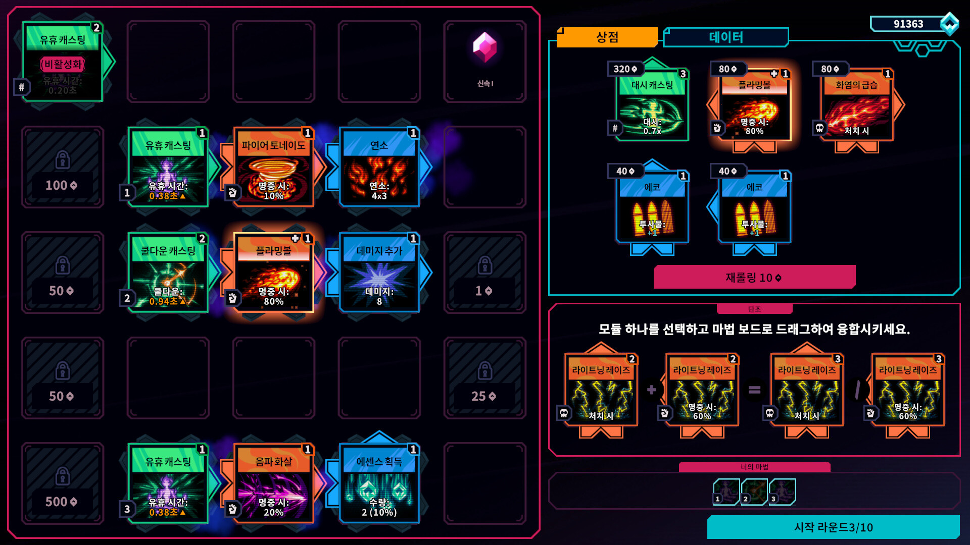 연속적으로 발사되는 음파 화살이 더 좋으신가요, 아니면 느리지만 강력한 불덩어리를 선호하시나요? 아니면 화면을 가득 채우는 무시무시한 번개가 더 좋으신가요? 게임에는 100종 이상의 마법 요소가 있어 자유롭게 조합할 수 있습니다. 이 다양하고 변화무쌍한 스킬 조합 속에서 당신만의 전투 스타일을 탐구하고 적을 물리칠 최고의 전략을 찾아내세요! 매 전투마다 새로운 즐거움을 느낄 수 있습니다!