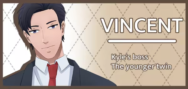 Vincent is outgoing and playful, but he's serious when it comes to his job. He works hard to maintain his fashion company. He has a bad habit of lashing out at people when he's feeling stressed. Vincent doesn't like relationships within the office. He especially dislikes it if an employee has a crush on him. Due to his busy schedule, he hasn't gotten the time to relax and go out with someone.