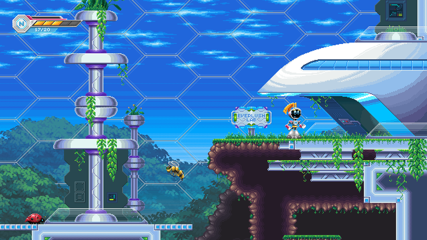 A vast, diverse space colony awaits Nixie on his rescue mission. Explore a non-linear, 2D environment full of intriguing areas, ranging from the vibrant halls of an opulent gallery, the wild nature of an overgrown bio-dome, the eerie remnants of an abandoned human city, and much more!