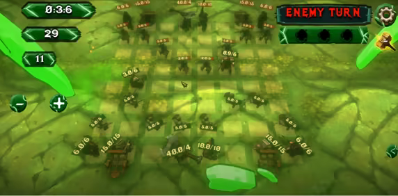 War Maze matches are played on a map of tiles, similar to chess. Each piece has different tile-based movement and attack patterns. Each piece also has a certain amount of attack and health points.