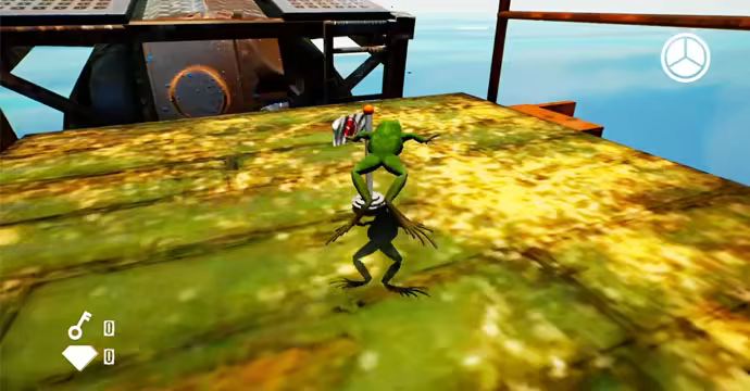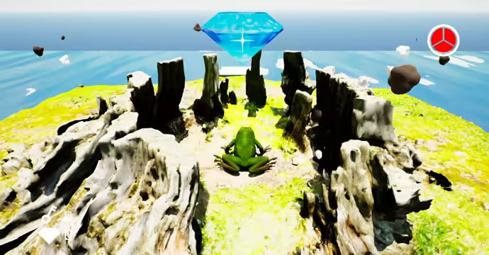 You're on a poor island where most of the inhabitants have left the island, due to the fact that it's a shantytown, and the island is gradually becoming deserted. One day, all the cars, bits of earth, cans, objects and so on began to rise towards the sky, and all of a sudden, time stopped. Rumor has it that a black hole caused time to stop, which explains the objects floating in the air, but we can't understand why there are no humans left on Earth. Grumpy, the frog, has been living in the shantytown since he was born, and ever since he was a child he's been curious, so he decides to go and see what's going on up there. The other frogs told him, "You're just a frog, you won't make it". Since then, Grumpy has had one thing on his mind: to go up there.