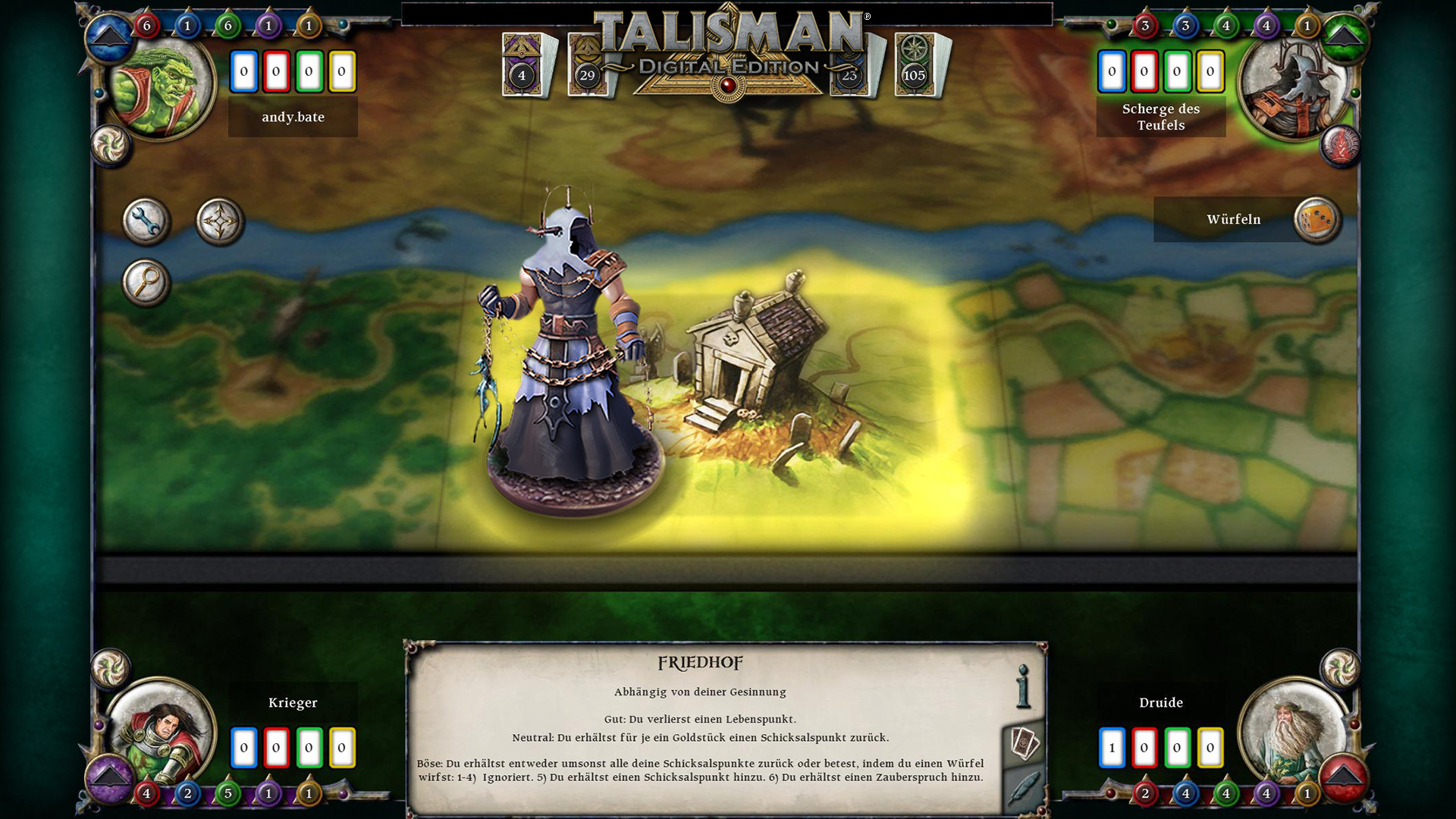 Wenn du auf dem Friedhof oder der Verwunschenen Lichtung landest, kannst du dich dazu entscheiden, das Feld nicht zu erkunden. Regeneriere stattdessen einen Lebenspunkt, gewinne einen Zauberspruch dazu oder lass dich auf ein anderes Feld derselben Region teleportieren.