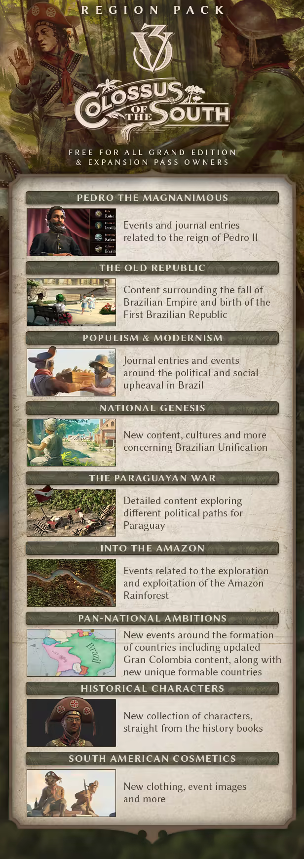• More content for South America: New events and journal entries and flavor for many countries in the region!