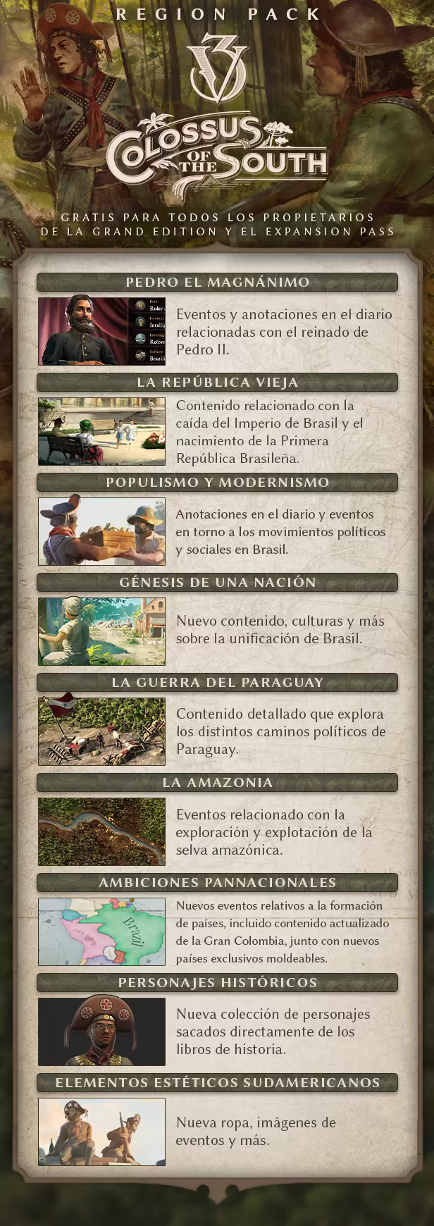 Victoria 3: Colossus of the South incluye contenido relacionado con: