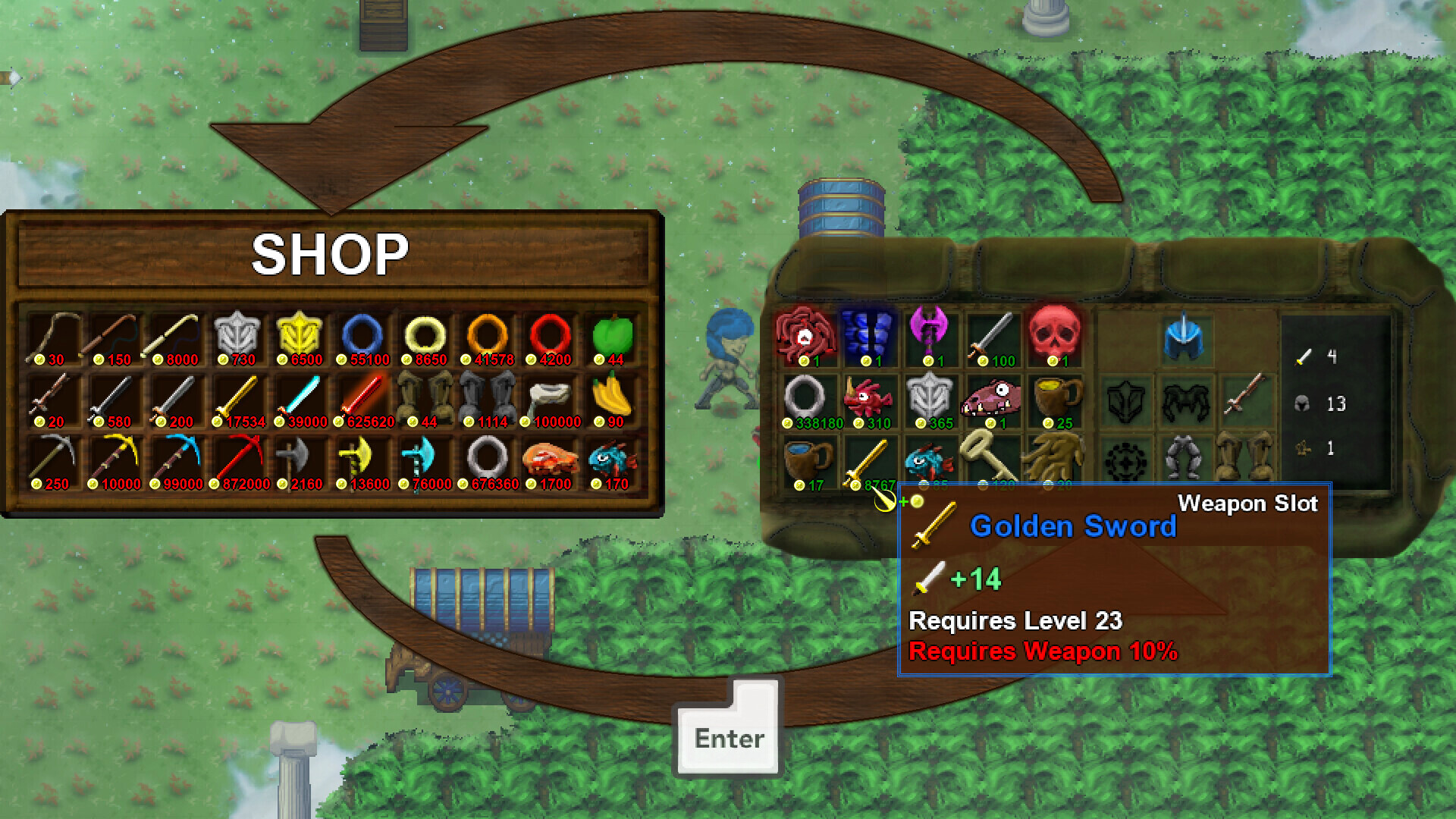 Collect Items and Upgrade Gear: Delve into ancient ruins and treacherous dungeons to uncover rare items and improved gear. Collect an impressive array of weapons, armor, consumables, and many other resources that evolve as you do. As you collect tokens from bosses or receive gold coins from trading, can you buy equipment from artisans, enhancing your prowess on the battlefield.