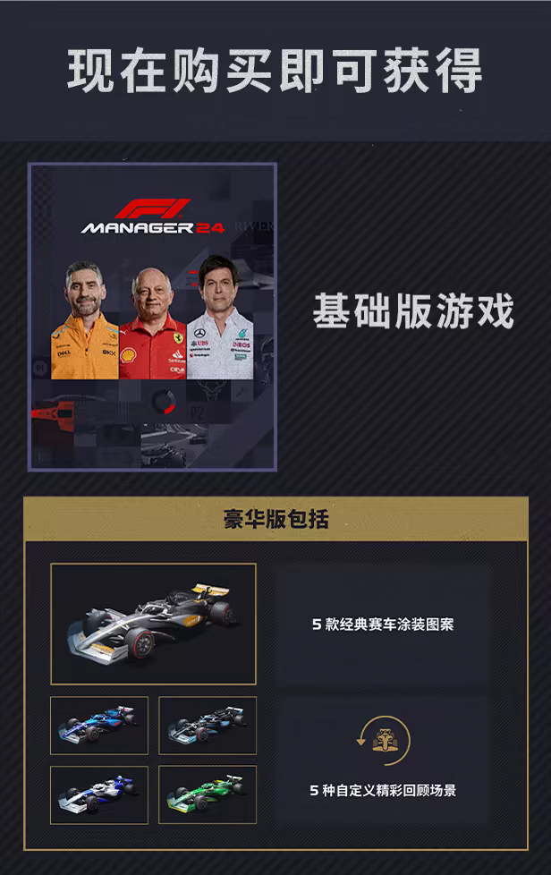 《F1®车队经理2024》豪华升级包内含5款用于创建车队模式的经典灵感涂装图案和5种自定义精彩回顾场景,为最具策略头脑的车队领队带来极致考验。