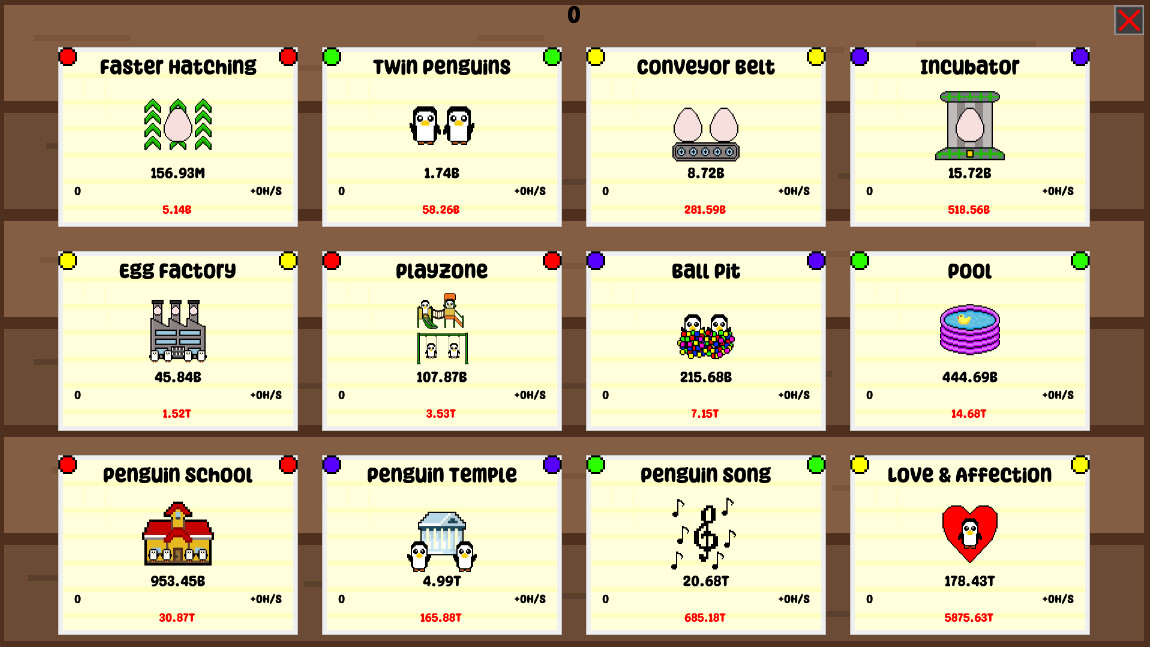 Penguin Hatchery is a game about hatching penguins. Yeah, that's pretty much it. With the help of some clicking and some random things that sometimes make sense, sometimes don't you can begin to hatch penguin eggs and eventually hatch them at an insane rate! Buy upgrades in total multiples of 25 to see which ones will appear in your village!