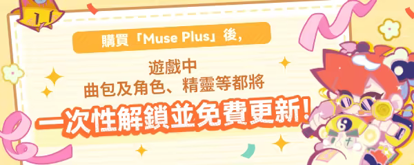 購買「Muse Plus」後,將一次性解鎖遊戲內現有的大量曲包(現有近 500 首歌曲)、角色、精靈、歡迎界面和插圖!