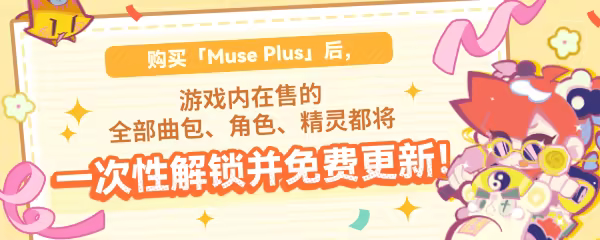 购买「Muse Plus」后,将一次性解锁游戏内现有的大量曲包(现有近 500 首歌曲)、角色、精灵、欢迎界面和插图!
