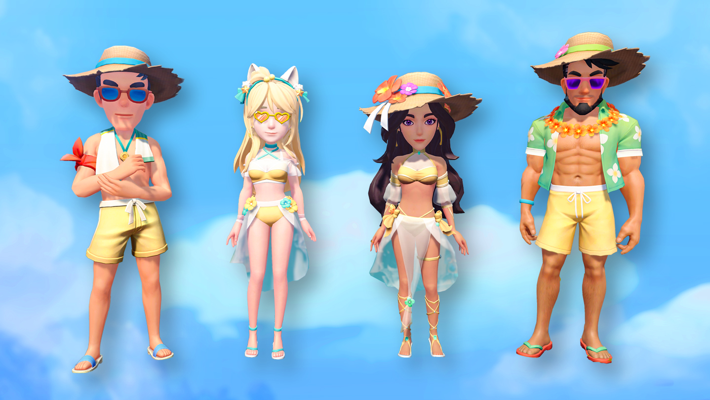 A swimsuit collection with outfits for Nia, Unsuur, Amirah, and Owen in 4 colors for each character. Each outfit contains a hat, top, bottoms, shoes, and 3 additional accessories.