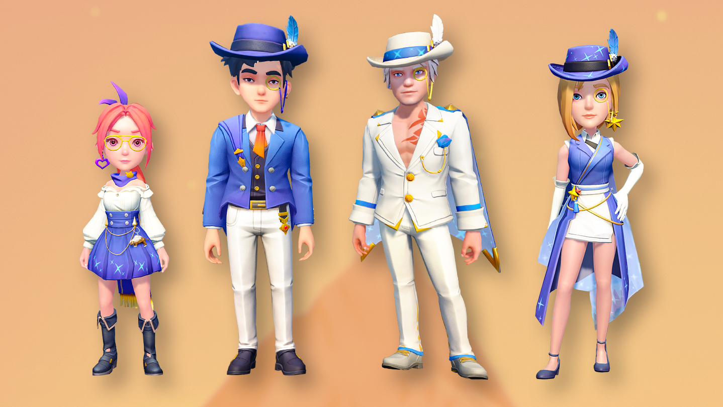 A starlight costume collection with outfits for Logan, Grace, Elsie, and Qi in 4 colors for each character. Each outfit contains a hat, top, bottoms, shoes, and 3 additional accessories.
