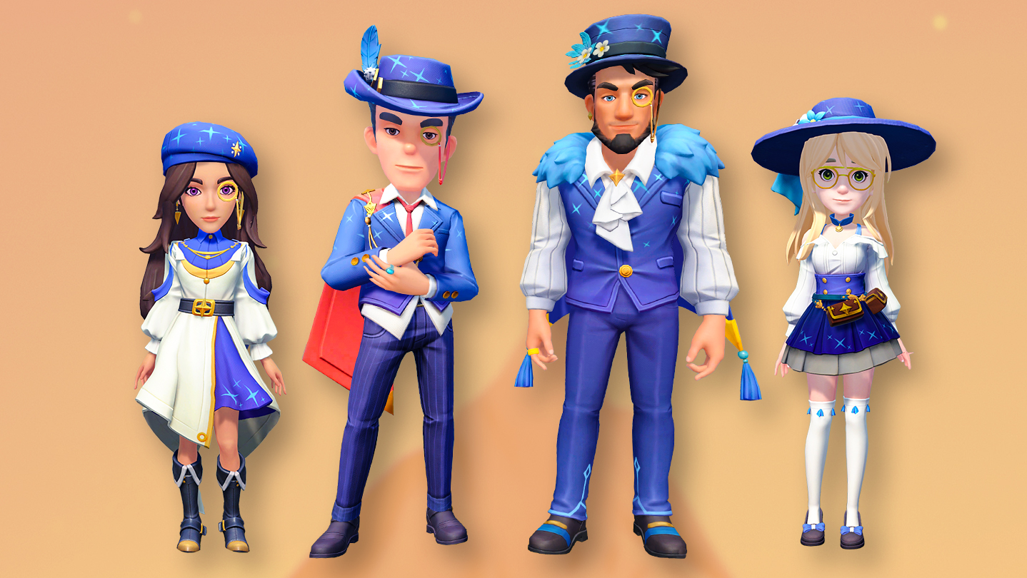 A starlight costume collection with outfits for Nia, Unsuur, Amirah, and Owen in 4 colors for each character. Each outfit contains a hat, top, bottoms, shoes, and 3 additional accessories.
