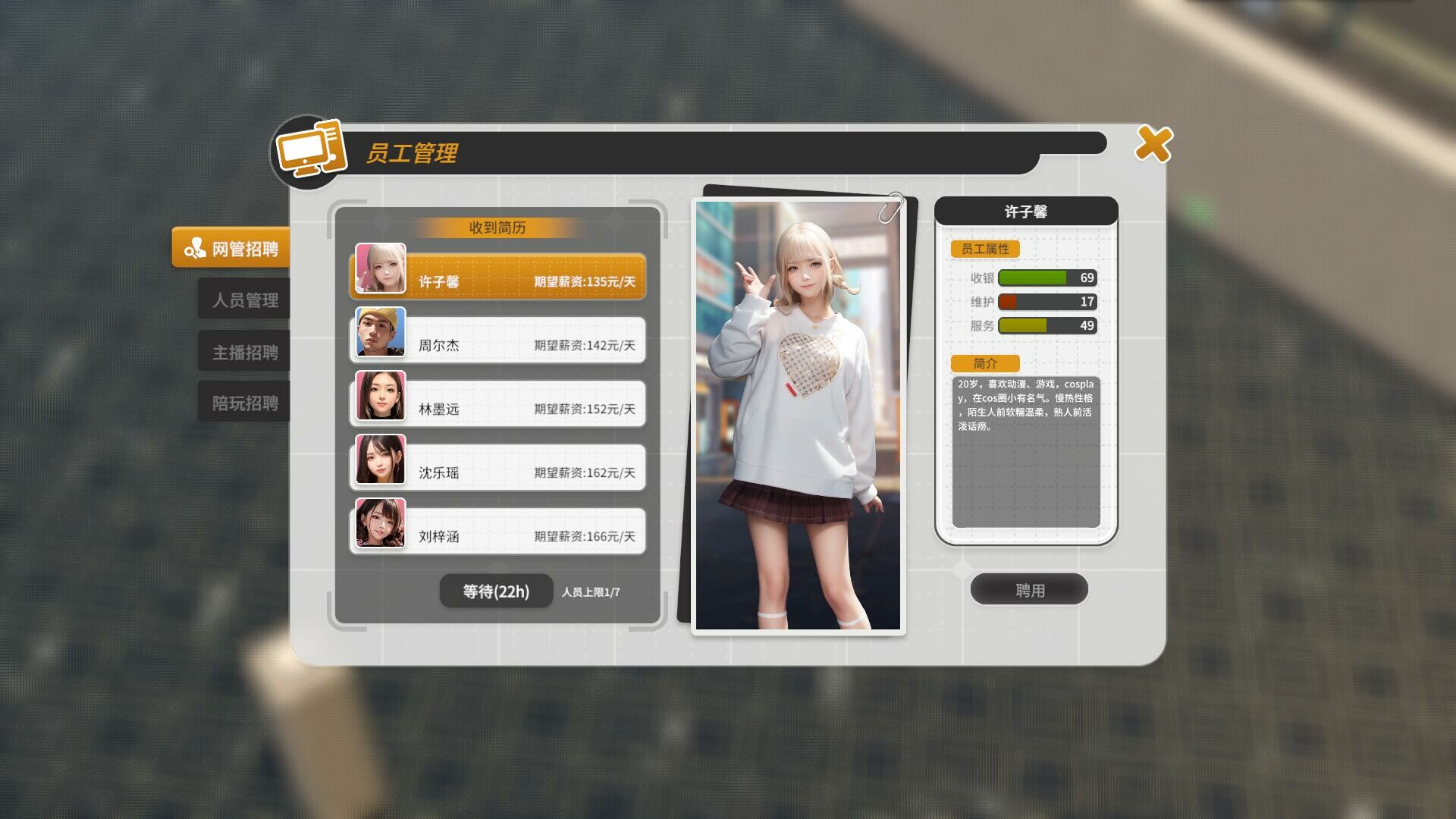 颜值超高的网管,将陪伴你。你需要合理分配他们的工作,及时发布指令,注意他们的工作状态,在合适的时候调整薪资。当与他/她逐渐亲密时……