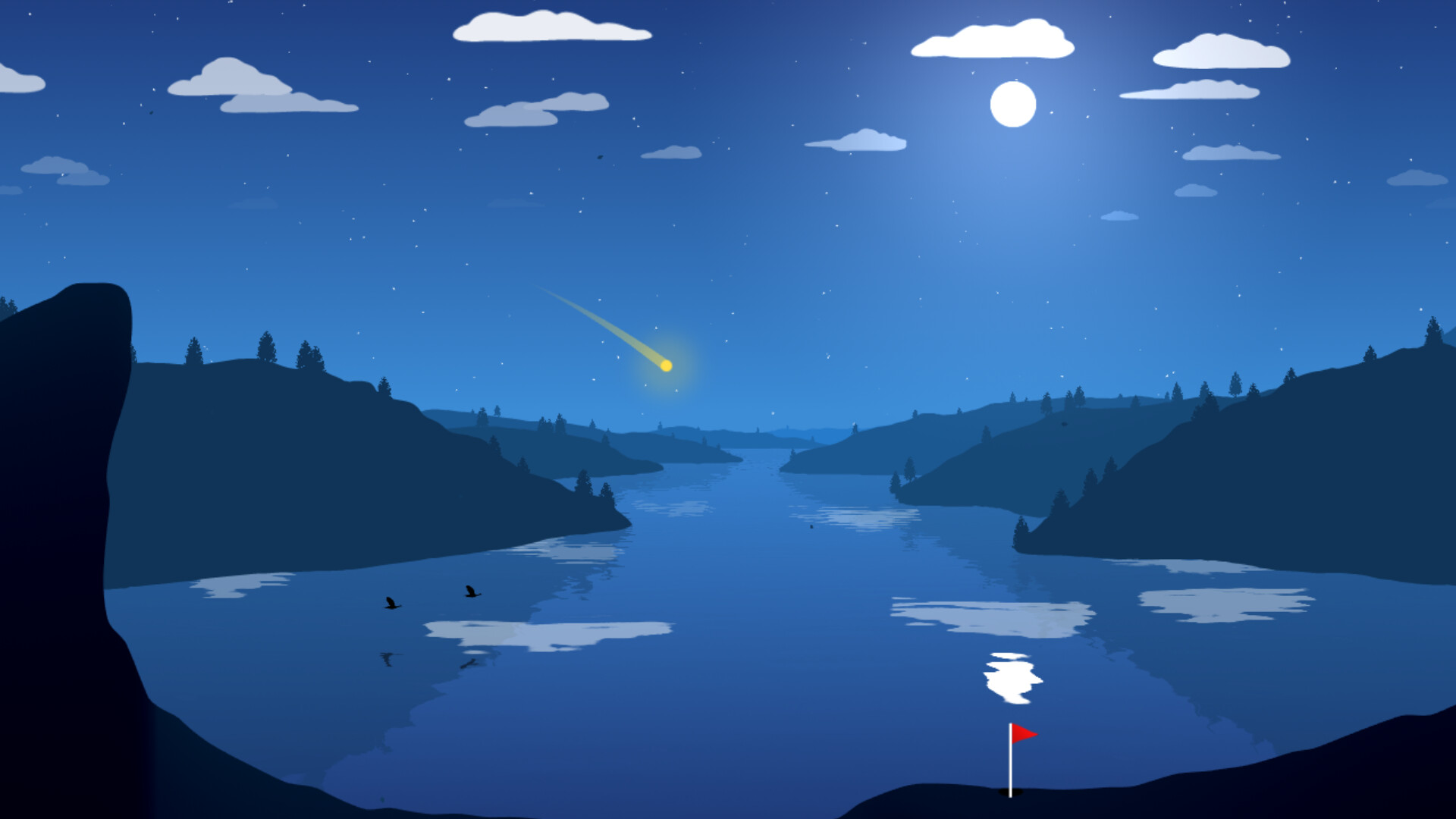 • Stylized graphics beautiful designed art with flying birds, moving clouds, particles and water effects.