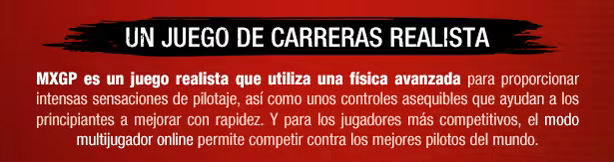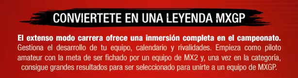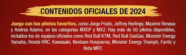 Tras un descanso de 3 años, vuelve el juego oficial del MXGP. Experimenta todo el campeonato del MXGP de 2024 con sus 20 circuitos oficiales y más de 50 pilotos de MX1/MX2. Sumérgete en el MXGP con un completísimo modo carrera.
