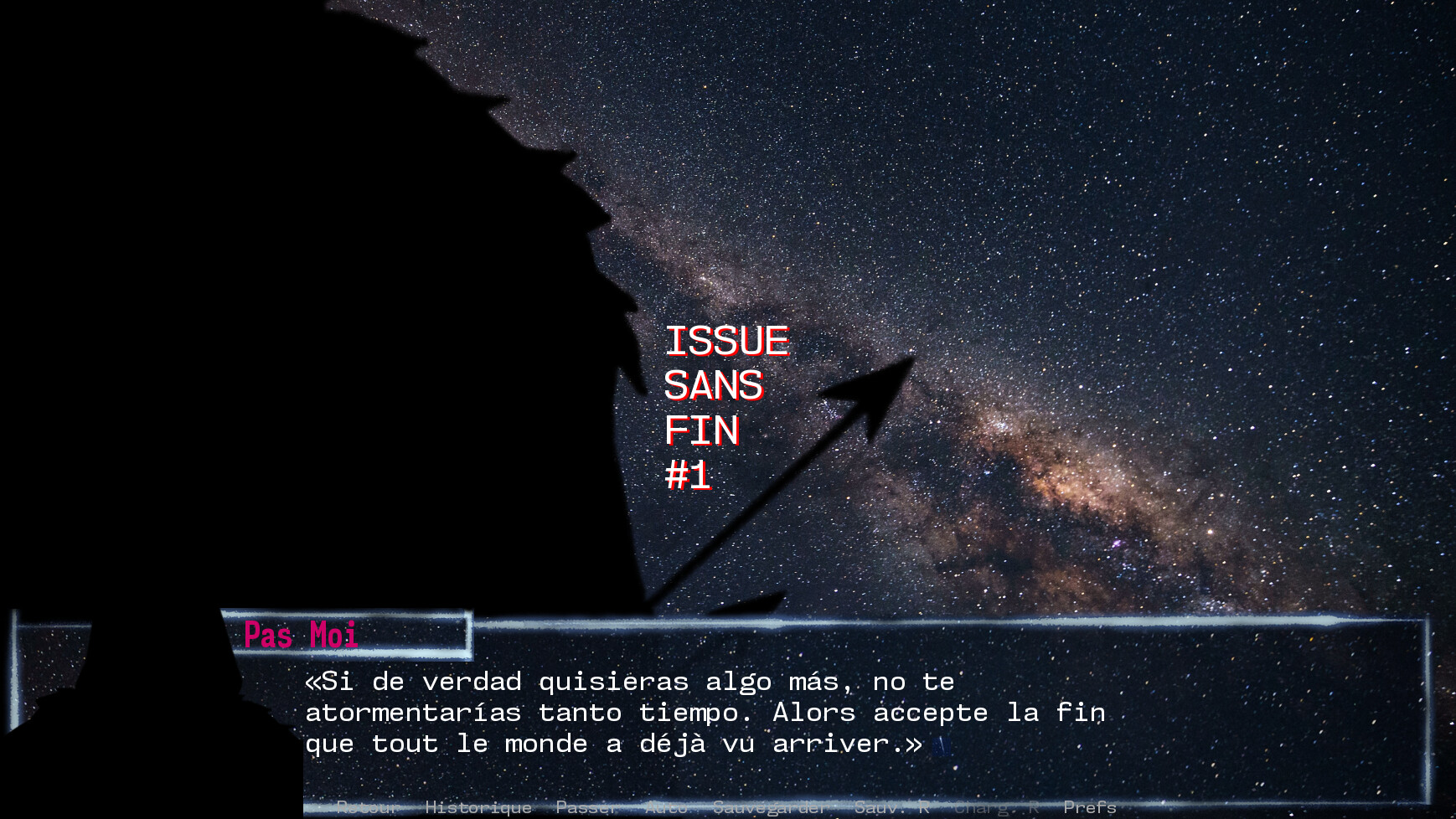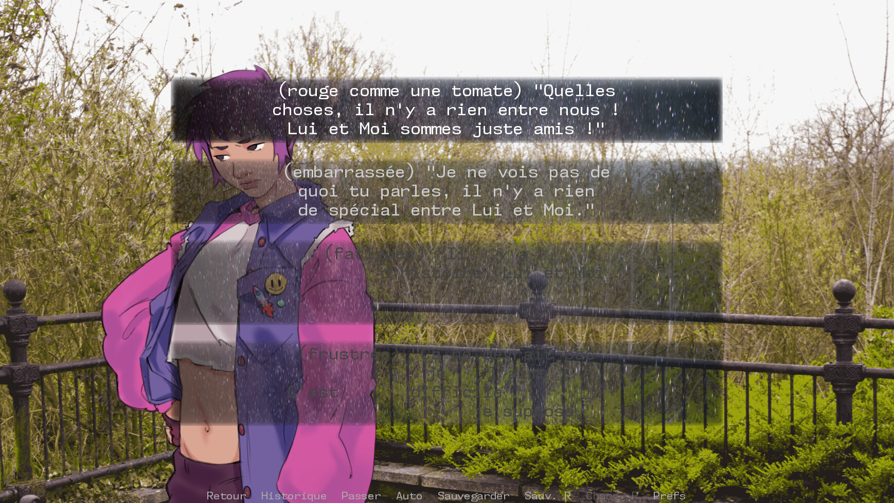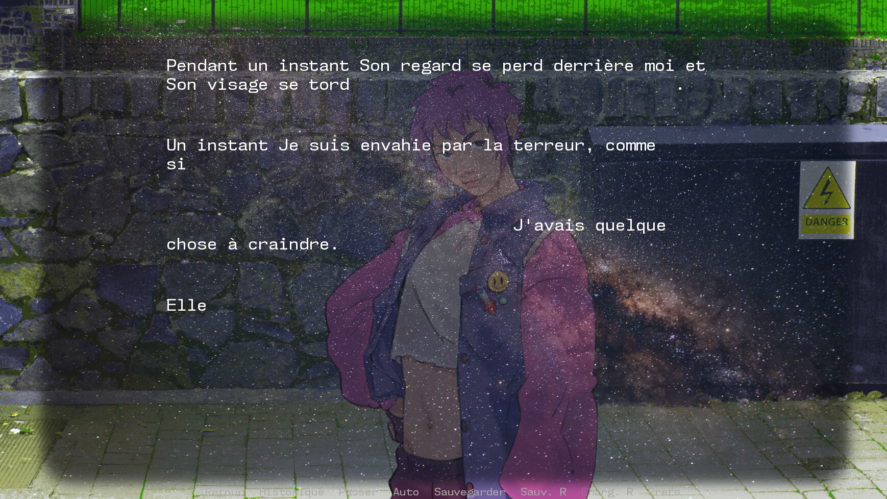 Un visual novel d'horreur/romance queer, sur le thème des mots et choix invisibles tant que le chemin qui mène à eux n'a pas été découvert.