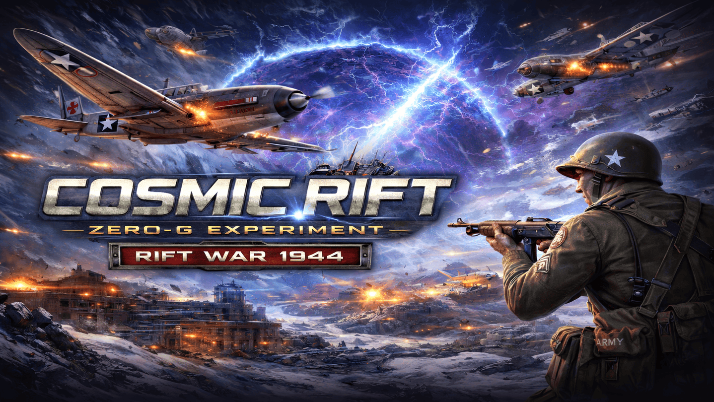 Cosmic Rift: Zero-G Experiment – Rift War 1944 The war was never meant to reach the stars. In 1944, a classified zero-gravity experiment at a secret Arctic research facility tears open a cosmic rift above the battlefield. What began as a desperate wartime project spirals into an interdimensional catastrophe. Now the skies are unstable; gravity fractures, and reality bends. You are deployed as an Allied pilot, taking control of a heavily armed aircraft to push back against enemy squadrons, experimental war machines, and rift-corrupted threats emerging from the anomaly. The battlefield is no longer just Earth—it’s the sky itself. Enter the Rift. The war didn’t end in 1945; it tore reality open. Cosmic Rift: Zero-G Experiment – Rift War 1944