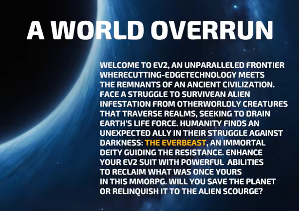 EV2 is a Open World, looter-shooter set in the frontier where cutting-edge technology meets the remnants of an ancient civilization. Defend humanity against a relentless global infestation of the Hive.