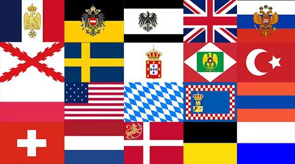 Play with France, Austria, Prussia, Great Britain, Russia, Spain, Sweden, Portugal, Kingdom of Italy, Ottoman Empire, Duchy of Warsaw, United States, Bavaria , Kingdom of Naples, Duchy of Nassau, Swiss Confederation, Kingdom of Holland, Denmark-Norway and Westphalia.