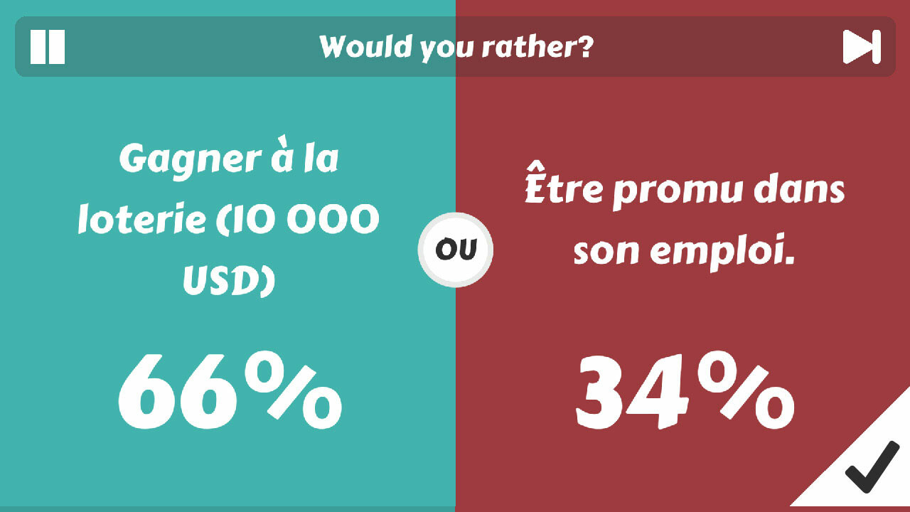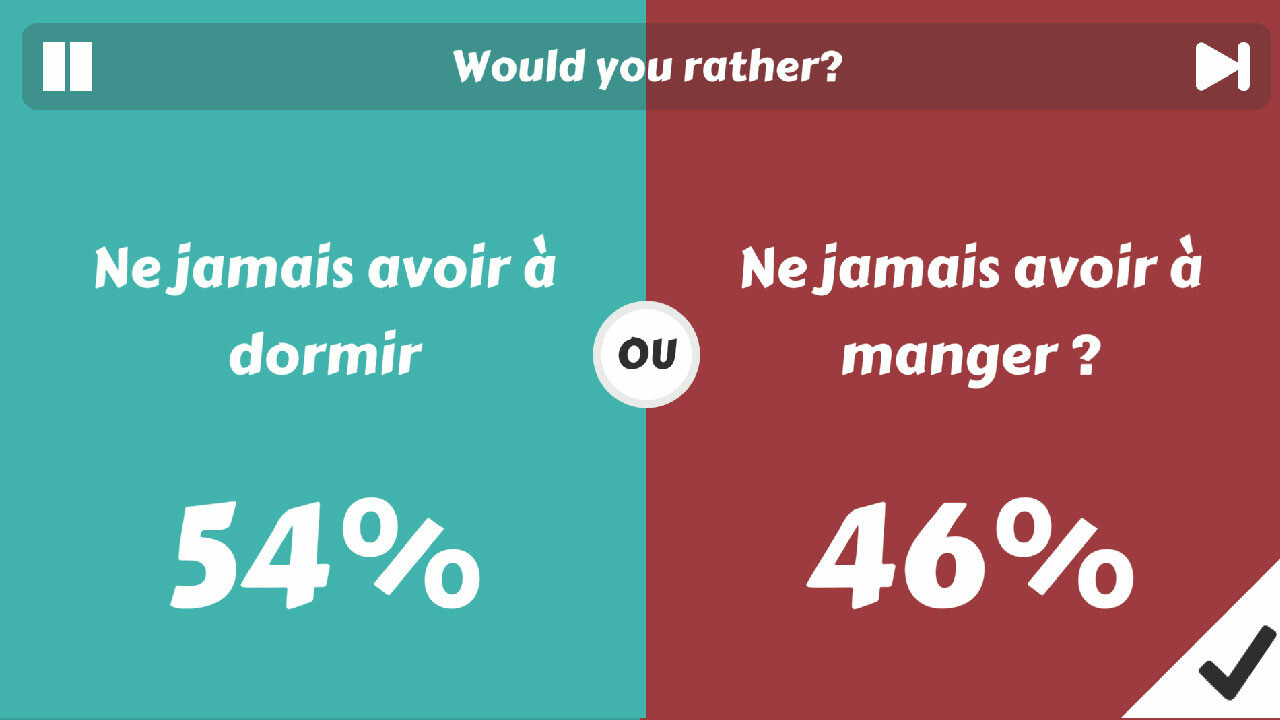• Notes supplémentaires : This game requires an internet connection to fully engage in real-time voting and access up-to-date results. While offline play is possible, we recommend staying connected for the complete experience, where your votes truly matter and reflect the global community's preferences.
