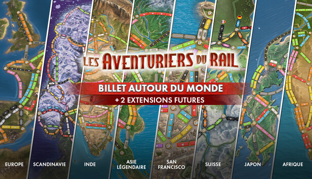 Pour construire l'empire ferroviaire ultime, vous avez besoin du Billet Tour du Monde des Aventuriers du Rail ! Avec le Billet Tour du Monde des Aventuriers du Rail, vous aurez un accès immédiat aux extensions actuellement sorties. Vous aurez également accès à toutes les extensions initialement prévues à leur sortie, pour un total de 10 extensions !
