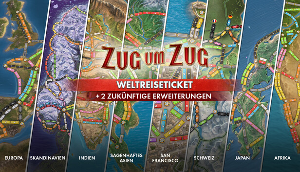 Um das ultimative Eisenbahnimperium aufzubauen, benötigen Sie das Rund-um-die-Welt-Ticket von Zug um Zug! Mit dem Rund-um-die-Welt-Ticket von Zug um Zug erhalten Sie sofortigen Zugang zu den derzeit veröffentlichten Erweiterungen. Sie erhalten auch Zugang zu allen ursprünglich geplanten Erweiterungen, sobald sie veröffentlicht werden, insgesamt 10 Erweiterungen!