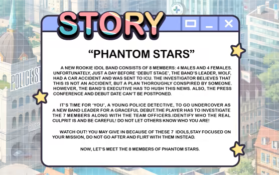 A Visual Novel of an investigaing-dating idols: “When a new police officer has to go undercover as an 'idol group leader' to solve a case.”