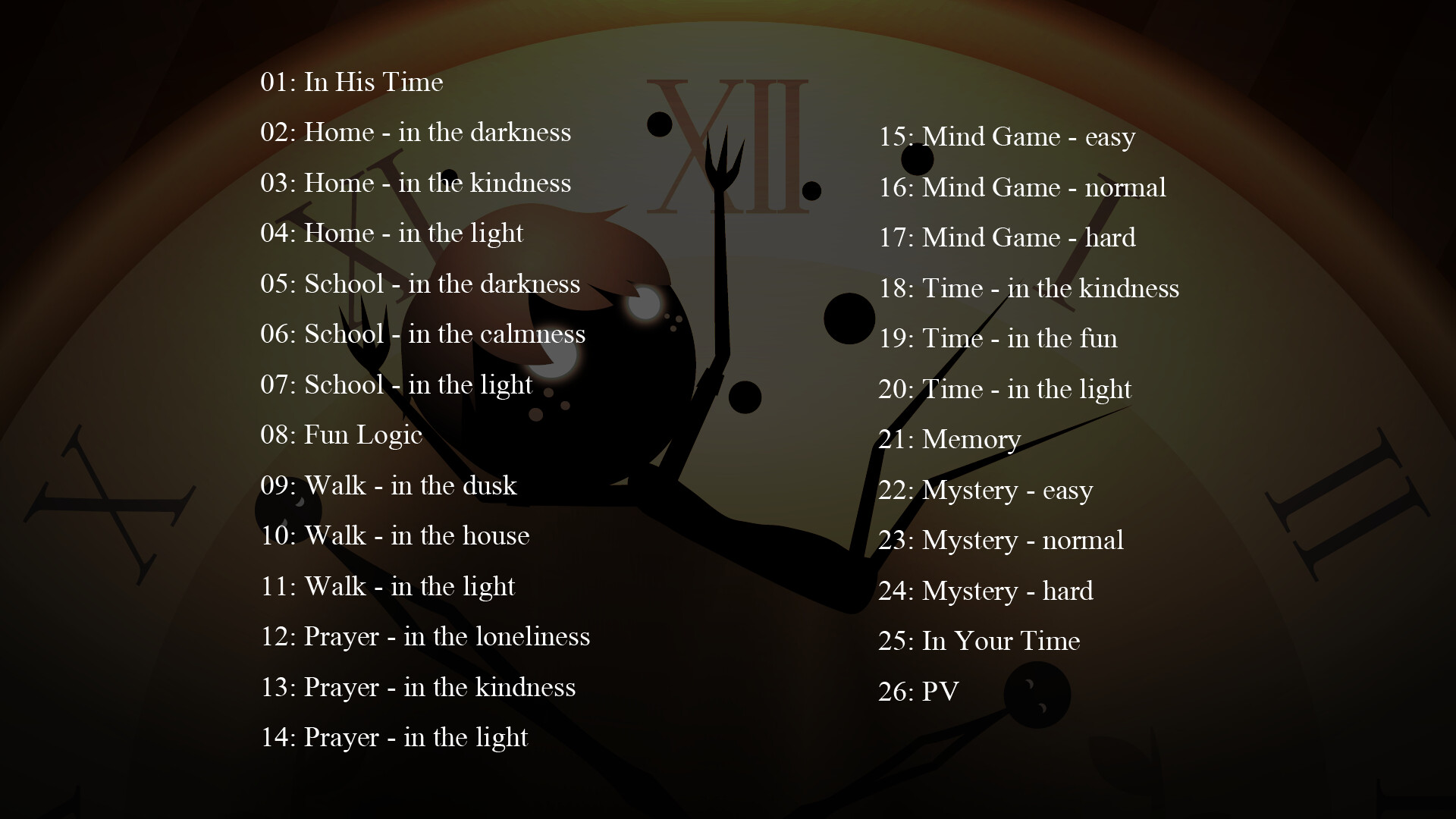 The soundtrack to 'In His Time'. It contains 26 gems of music from the game.