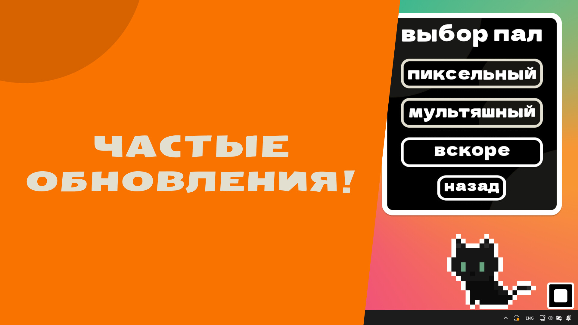 Игра предлагает продвинутые настройки кастомизации. Вы можете выбрать местоположение питомца на экране, его размер, возможности и многое другое! Настройте игру под свой вкус.