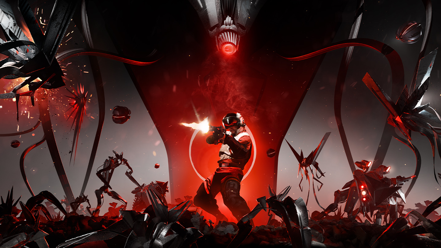 Fast paced Bullet hell Roguelite FPS 🔴 Fight relentless machines driven by a hostile AI. Escape an endless cycle. Craft infinite weapon variants with deep gun modding. Forge deadly synergies. Carve your way out through enviro destruction /BREAK THE SYSTEM /BREAK FREE