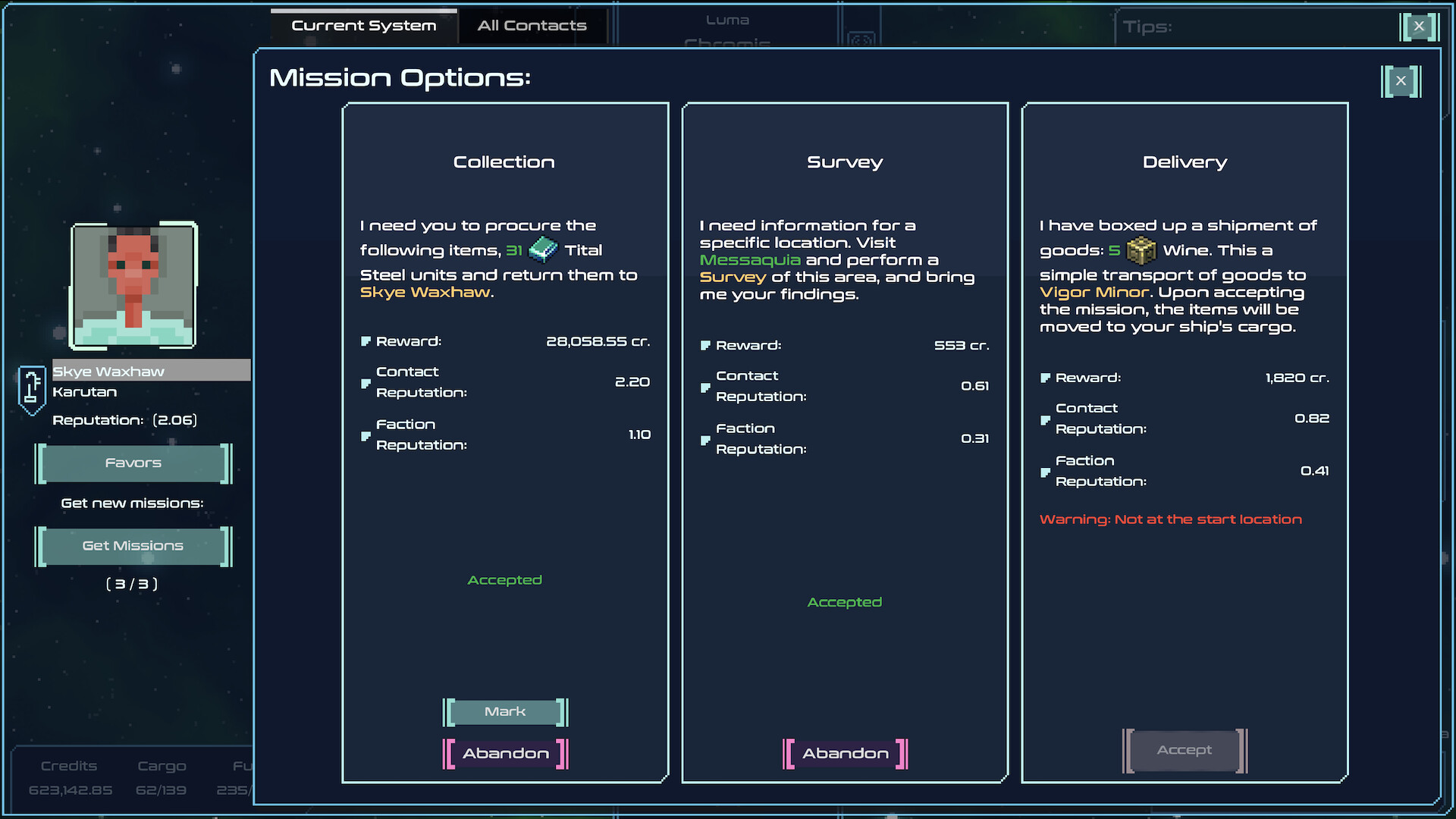 Become spacefaring merchant in a galaxy filled with diverse planets, each with its own economy, resources, and challenges. Amass wealth and reputation by trading goods, negotiating with factions, and navigating the intricacies of interstellar commerce.