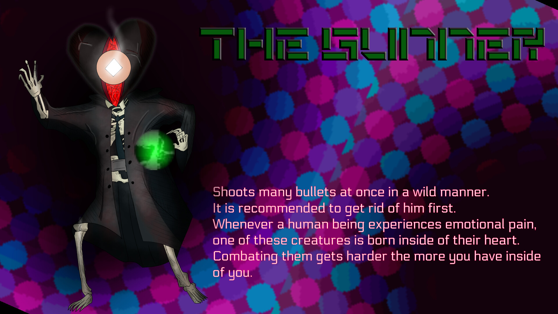 Slice, dash, and parry your way through your inner demons in this fast-paced psychedelic journey! Dodge an onslaught of deadly projectiles and unleash your blade upon nightmarish foes that lurk within your subconscious. Follow a dissident dealer and a jaded philanderer on their never-ending trip.