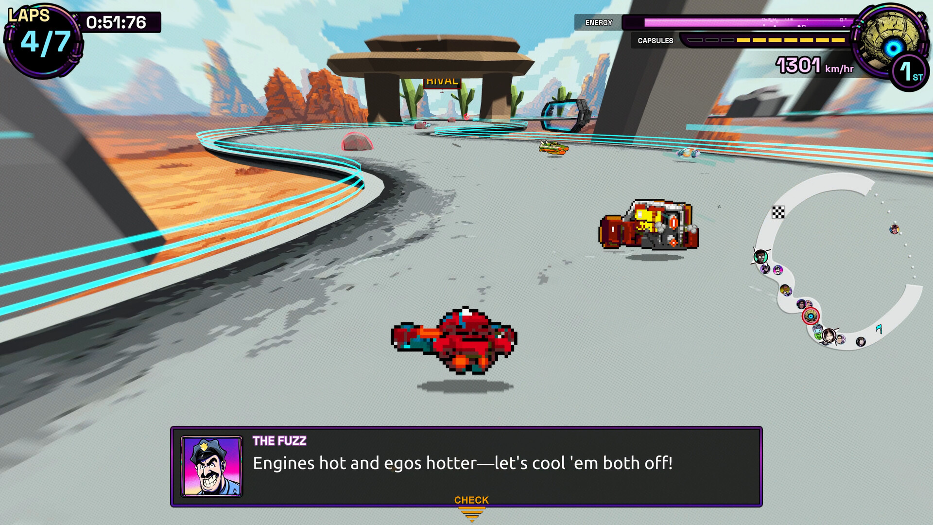 “One of the best parts of playing this game is experiencing the art style and music. Every character, every song, every corner or boost pad on a track, is made with pixel precision and sounds fantastic!”