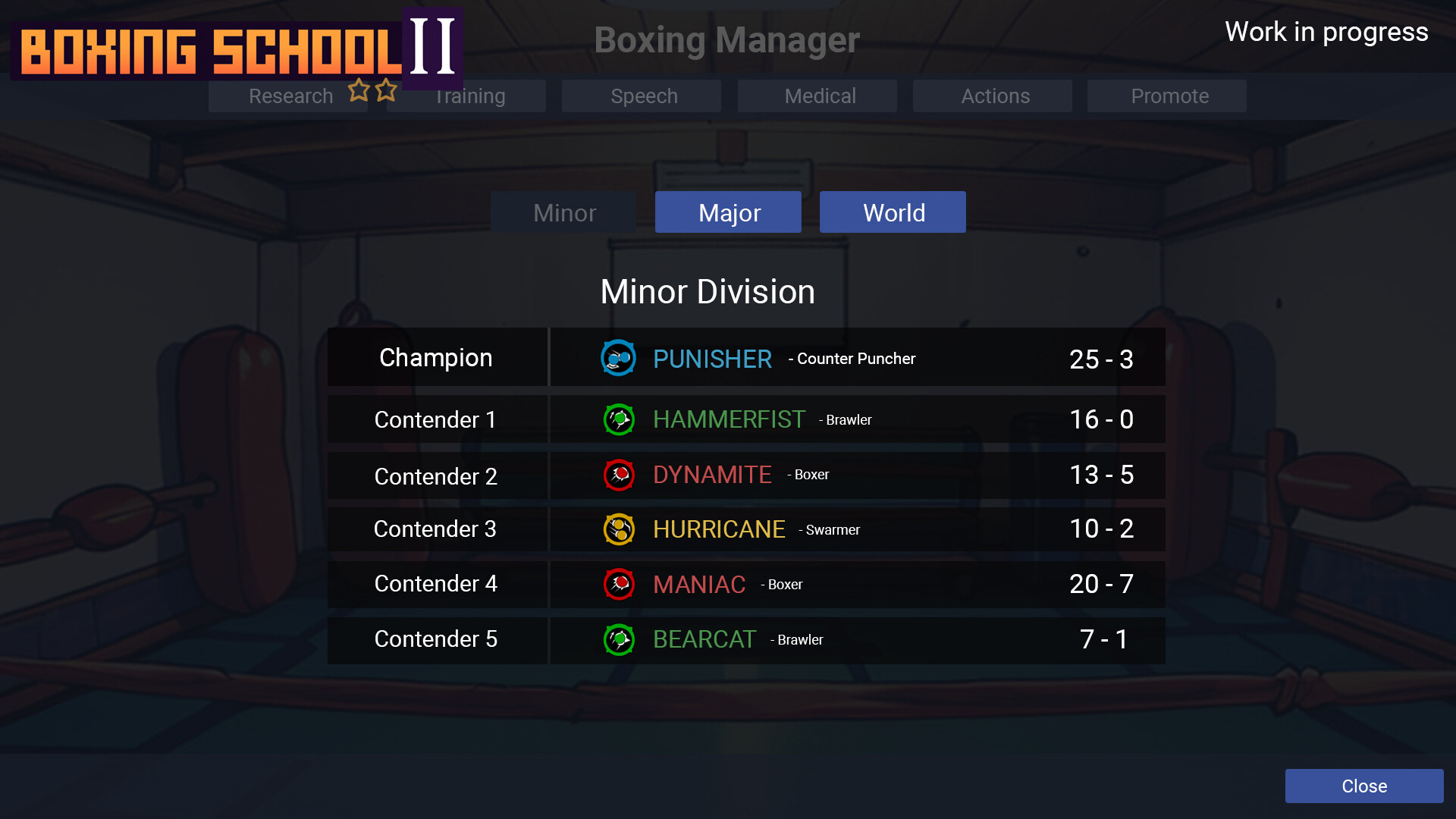 Just like in the previous Boxing School your boxers have unique fighting styles and skills. These 4 styles has been improved and now has expanded talent trees. Do you want to teach non-stop swarmer aggression or a slower boxer style with more punching power? Or maybe you just want your boxer to be able to counter-attack and prey on opponent's mistakes. Choose between a variety of fighting styles and skills. In Boxing School 2 there is new improved punching and blocking mechanics for fights that makes all styles more balanced.