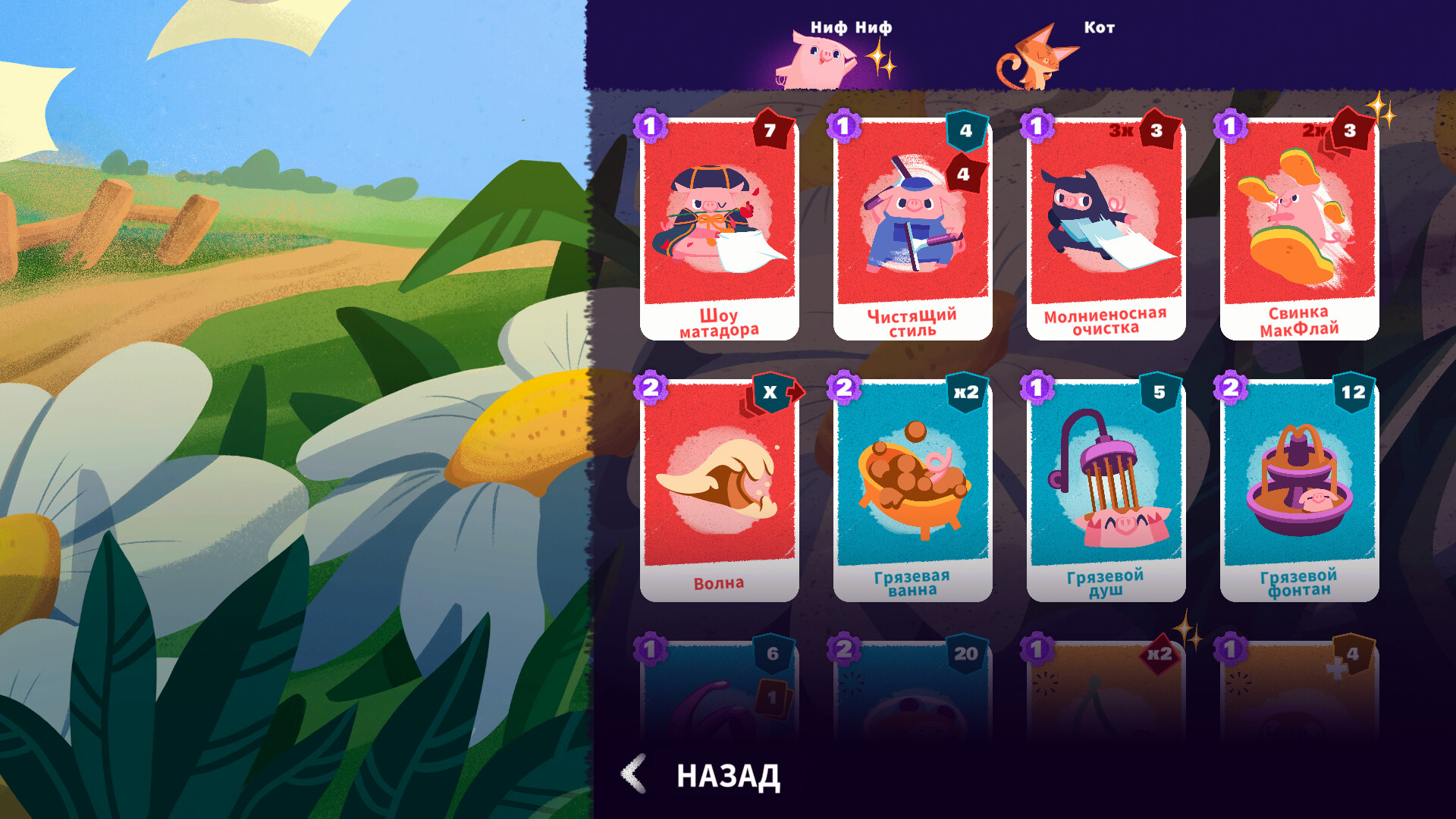 • Два играбельных персонажа – Ниф Ниф и Кот, каждый со своей уникальной колодой.