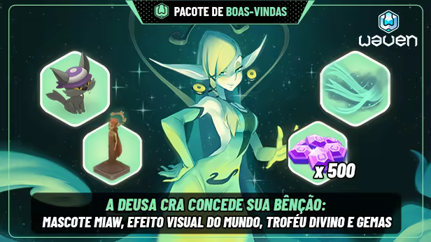 Você foi escolhido pela deusa Cra, divindade do julgamento que guia os arqueiros do Mundo dos Doze com seus olhos treinados. Ela decidiu abençoá-lo com o novo Pacote de Boas-Vindas para guiar você na sua aventura em WAVEN!