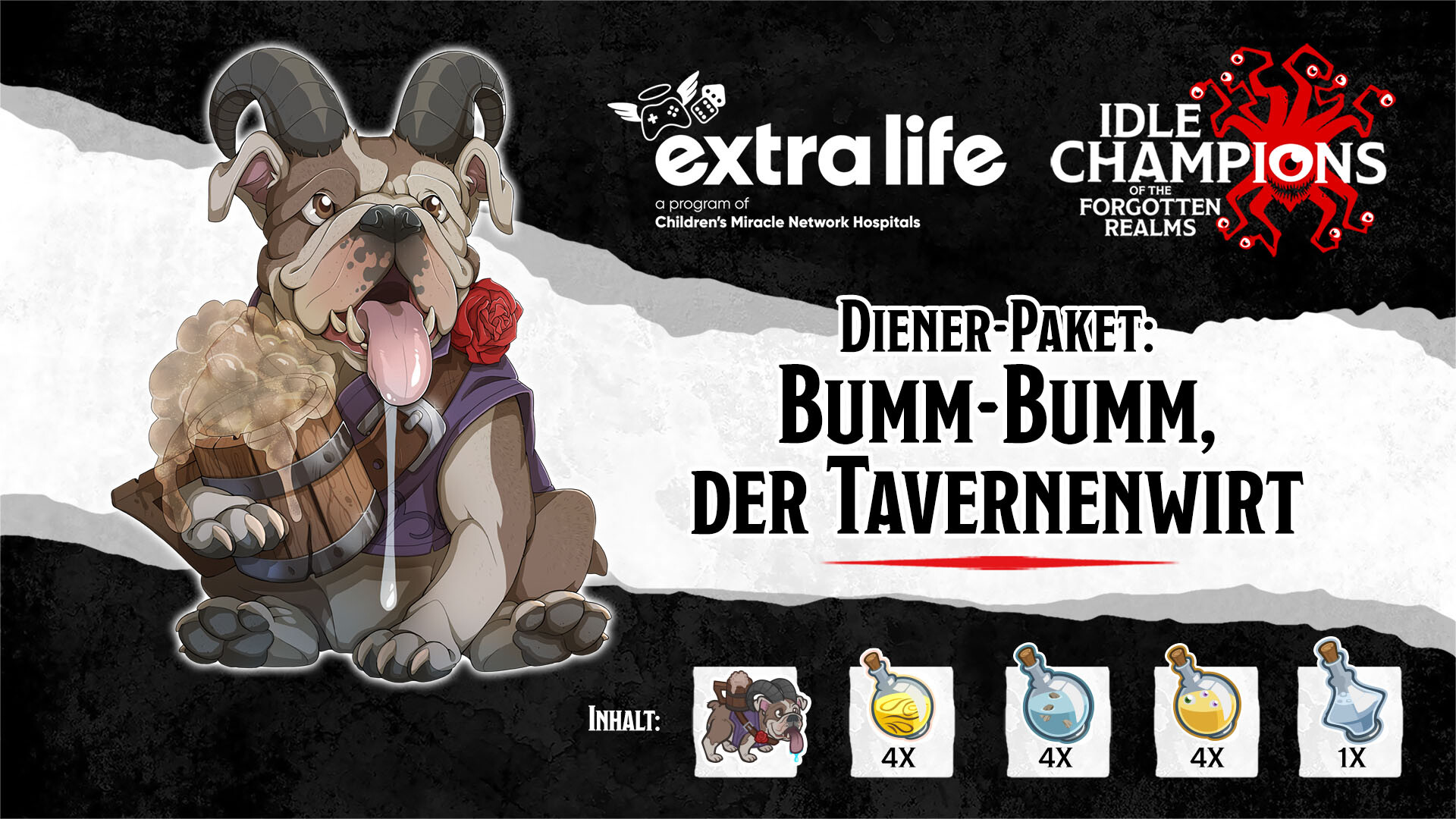 Wir sind stolz darauf, gemeinsam mit Todd Stashwick den Diener „Bumm-Bumm, der Tavernenwirt“ veröffentlichen zu dürfen! Der Nettoerlös aller „Bumm-Bumm, der Tavernenwirt“-Verkäufe von der ersten Woche nach Veröffentlichung wird an Extra Life gespendet.