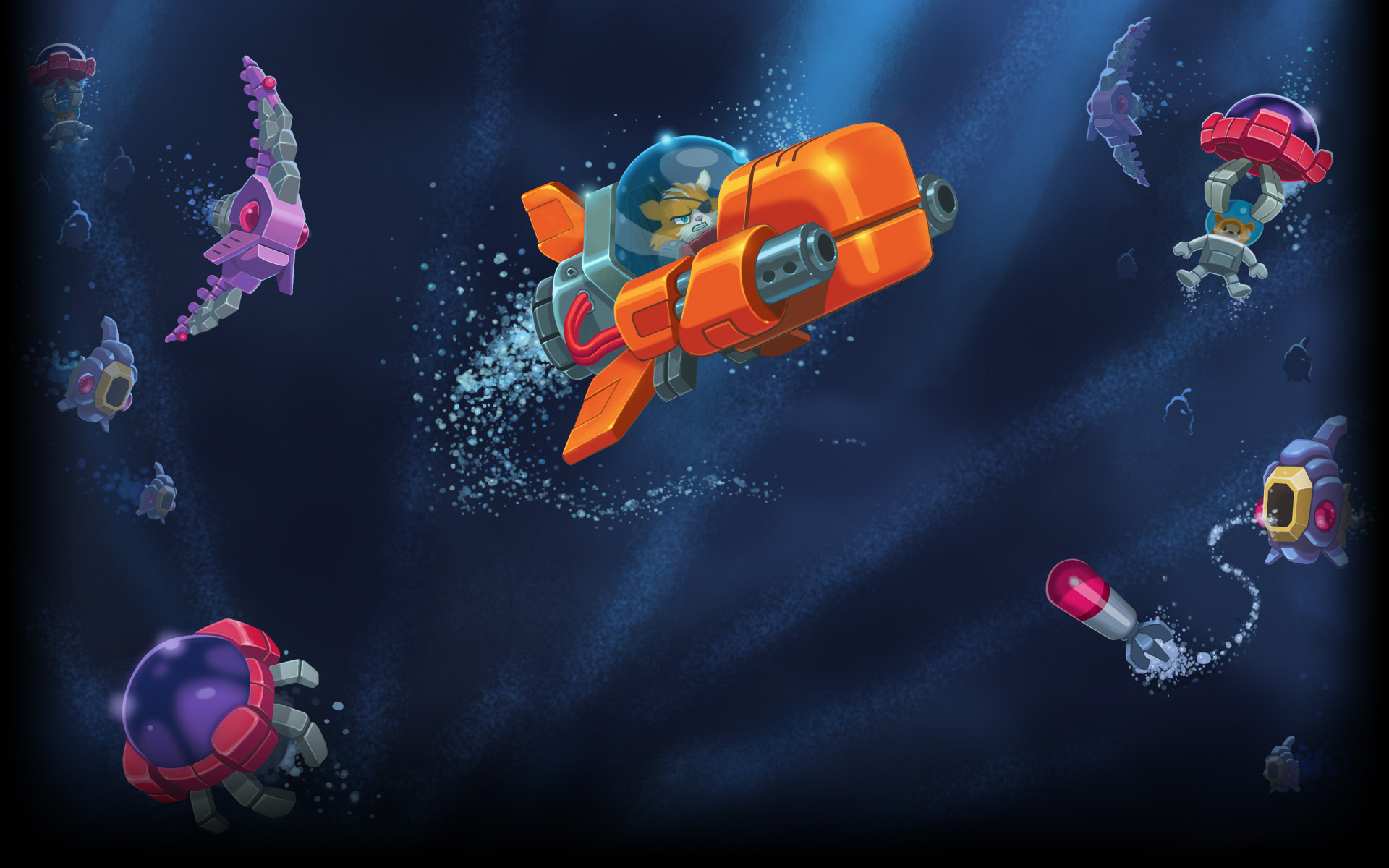 Blast through hordes of mechanical sea monsters in your kitty sub and defend the deep sea milk mining kittens!