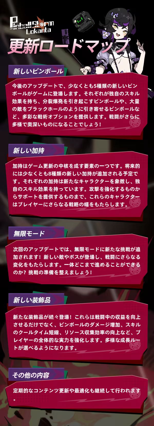 『ピンボール地獄LOKANTA』はローグとピンボール要素のゲームです。ゲームの中では、潮水のように寄せかかる敵と立ち向かい、エリートの敵に挑戦して、強大なボスと向き合う。ピンボールを武器とする反抗者として、仲間と出会いながら新しいピンボールを解放していき、戦利品でそれを強化しながら襲い来る敵を倒していく。