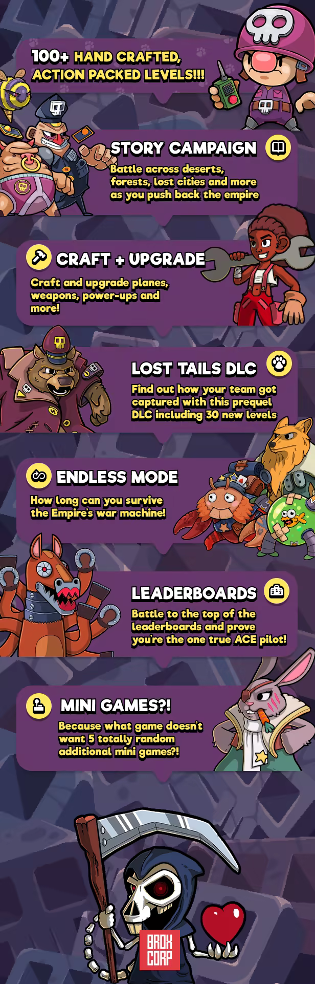Skies of Chaos is an arcade 'shoot em up' with 100+ levels of explosive action. Take on a sprawling campaign as you build your team of pilots to take down an evil empire in a vibrant post apocolyptic world.