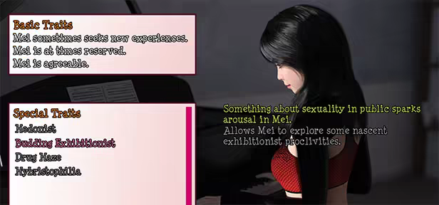 As the game progresses, the player will be able to pick up personality traits for the player's wife. She will act differently depending on her accumulated traits!