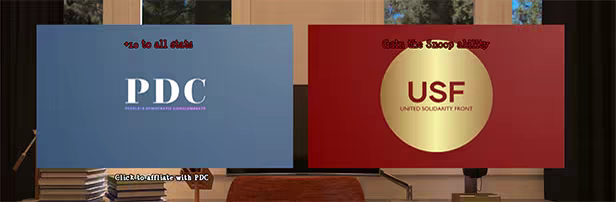 When the main character starts working, he'll be able to choose which political affiliation his company has. PDC will give him a stat boost, which will help with increasing Love Points with other characters, as well as influencing others. Choosing USF will grant the "Snoop" ability. He will be able to spy on others physically or with technology. Both options are valid for any style of playthrough, but if you want the full NTR (jealousy inducing) experience, USF is likely the better option.