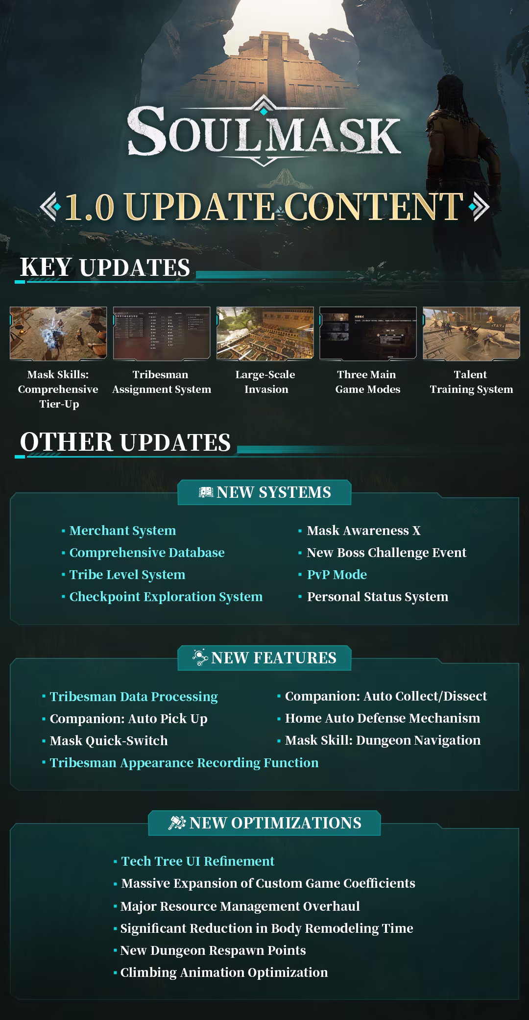 • Supports Steam Workshop and everyone can now unleash their creativity with our powerful Soulmask Modkits to craft a Soulmask experience unlike any other.