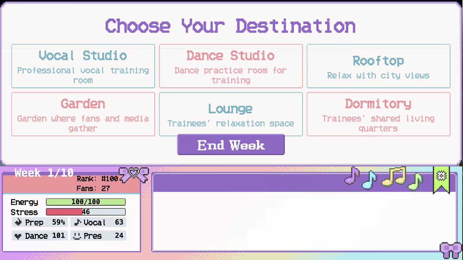 Idol Talent Show Simulation Game-Train from zero to idol debut! Rank high to stay in! Explore the map, manage your schedule and play mini-games.Face tough evaluations,compete with fellow trainees, and forge meaningful bonds. Your choices will unlock 10+ unique endings. Can you shine?