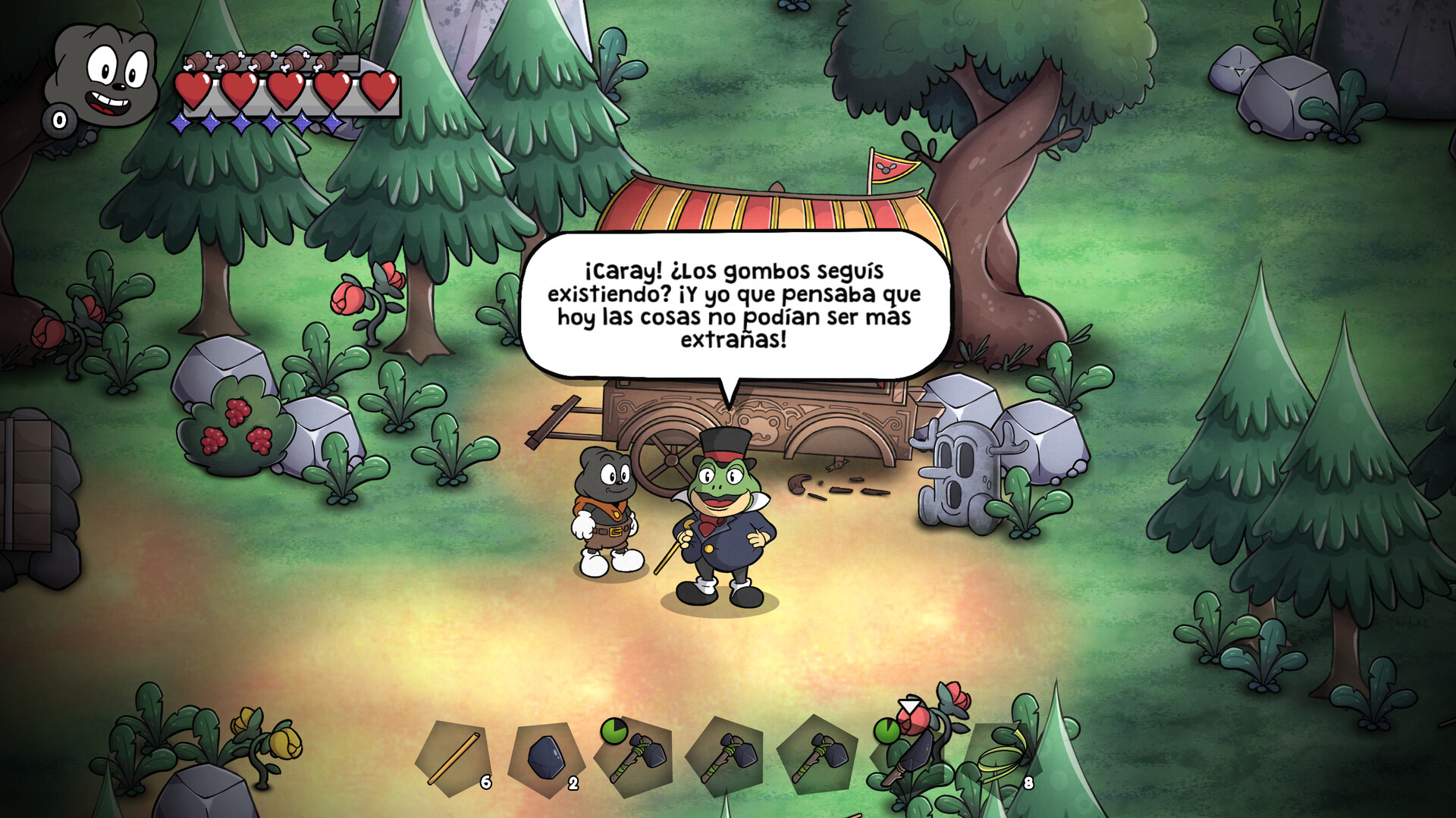 El mundo de Gombo está lleno de detalles, biomas dinámicos, mazmorras dibujadas a mano y un ciclo diurno y nocturno letal. Embárcate en un viaje y descubre los misterios de estas tierras encantadas, encárgate de misiones secundarias extravagantes y conoce a un elenco de personajes coloridos que estarán dispuestos a echarte una mano (o causar problemas).