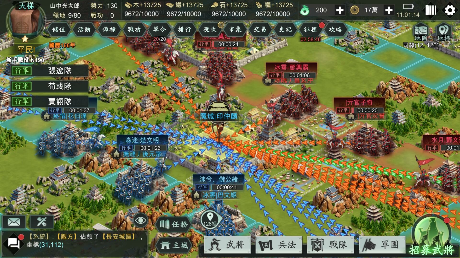 類MOBA地圖,佔領城池後,城池會派出遠徵軍協助徵戰,左中右三條進攻和防守路線,完美融合MOBA和戰爭策略。